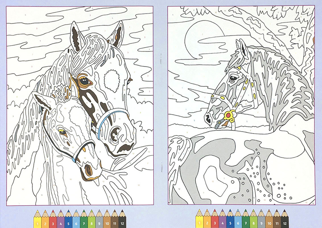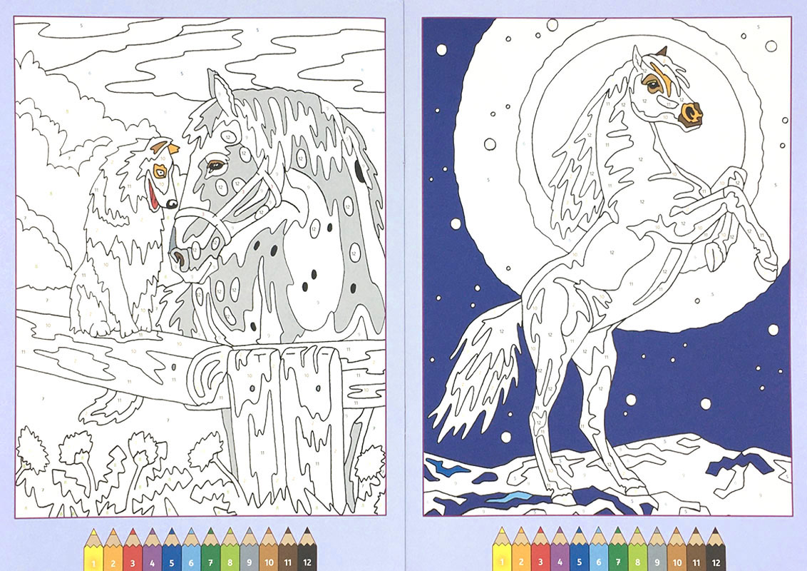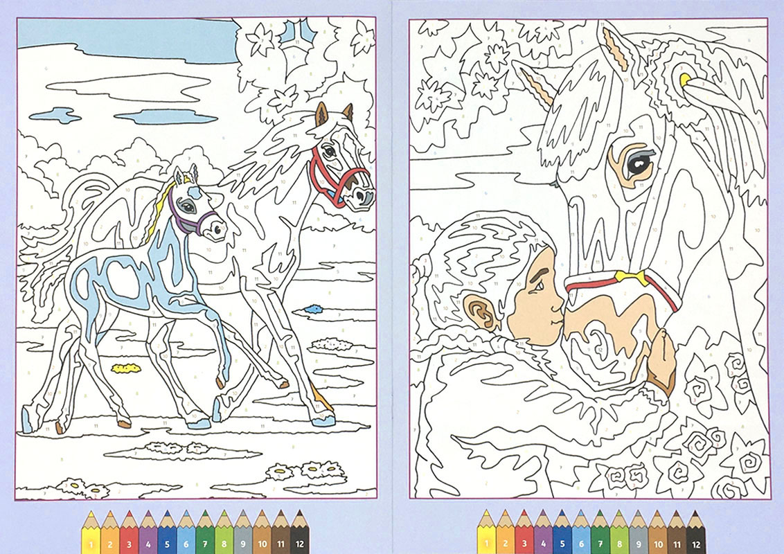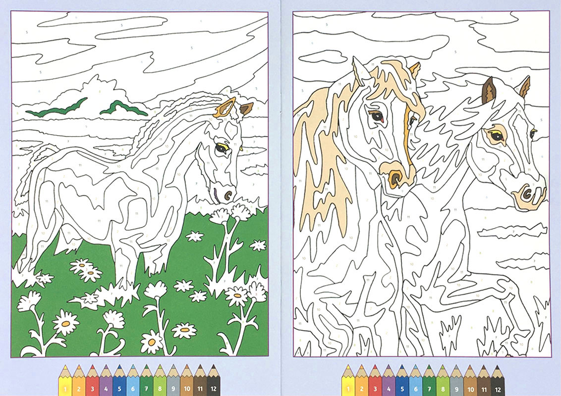 Alle Ausmalfelder enthalten Zahlen, die die Farben vorgeben. Feld für Feld entstehen so ansprechende, detailreiche Bilder.