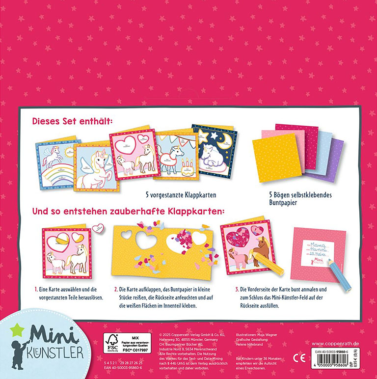 - Pappumschlag, 5 vorgestanzte Klappkarten + 5 Bögen selbstklebendes Buntpapier