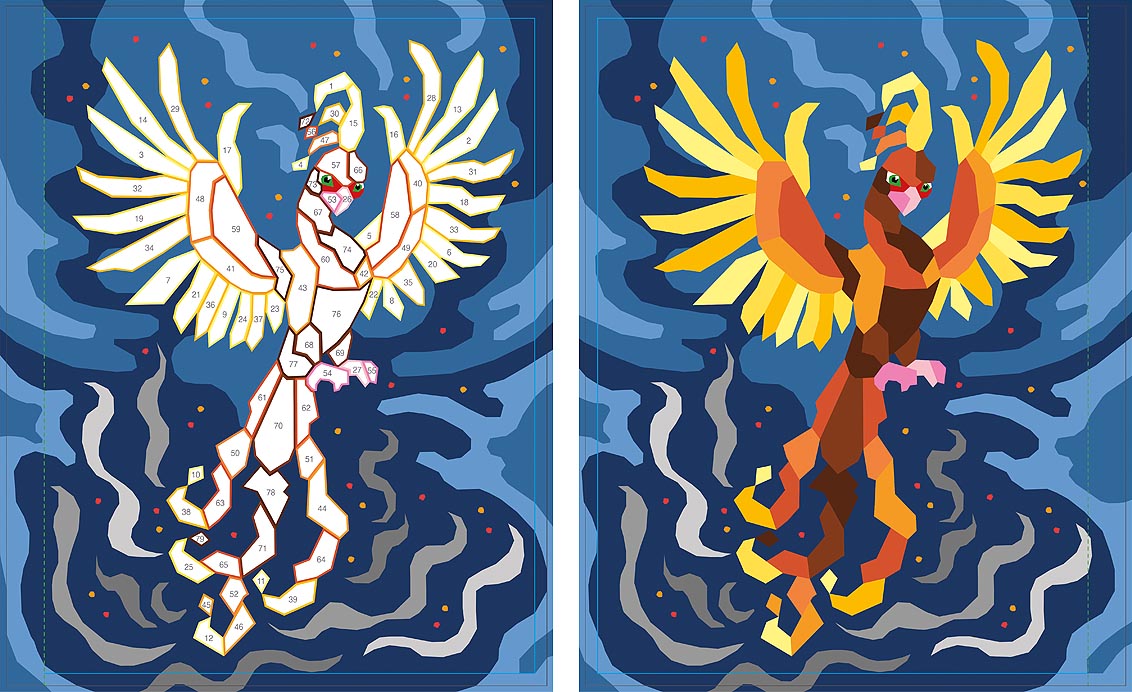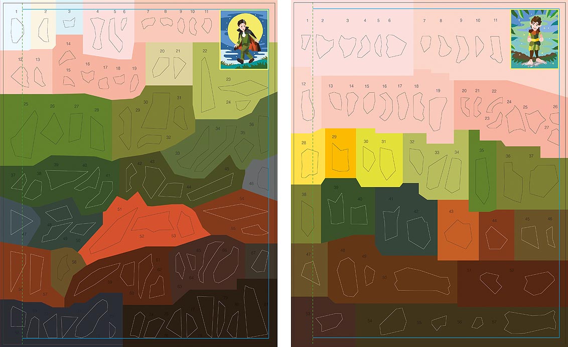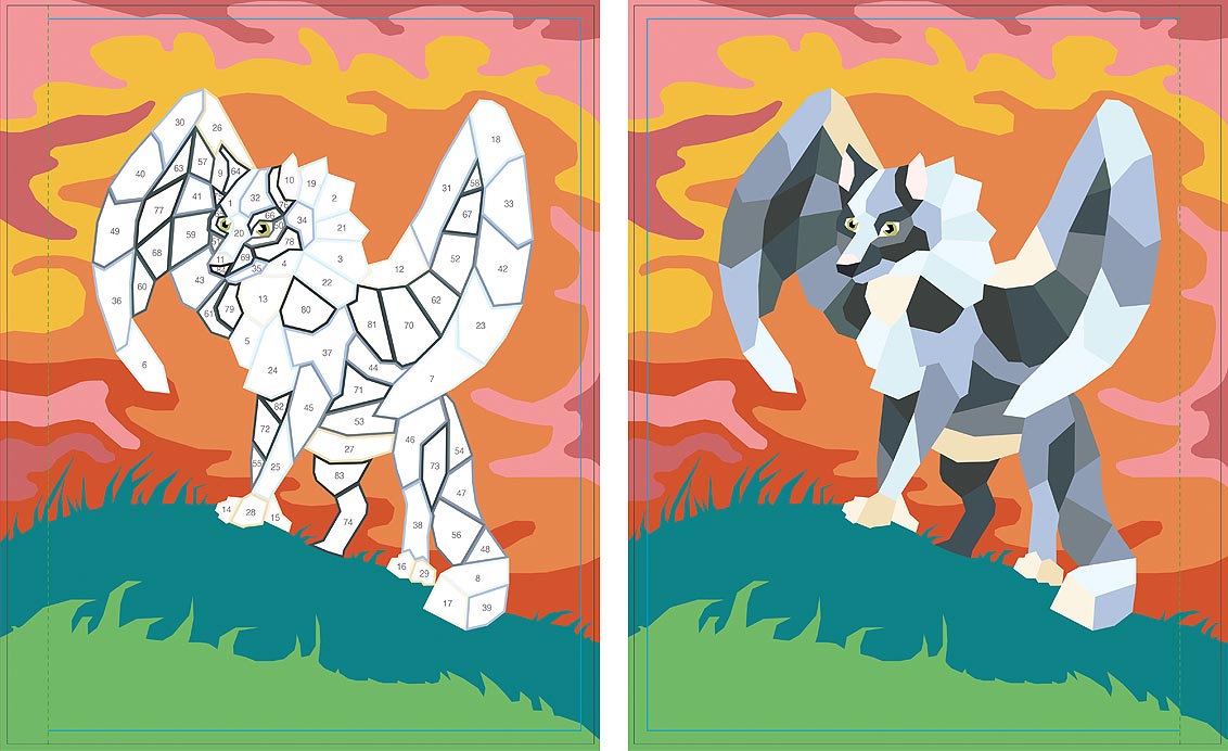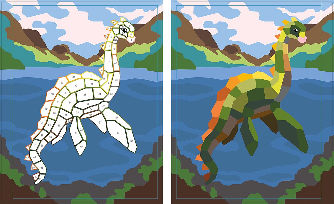 Die Motive sind in nummerierte Felder unterteilt, auf die passende Sticker geklebt werden. Die Anzahl und Größe der Sticker, aus denen ein Motiv besteht, variiert, sodass stundenlanger Stickerspaß für Anfänger*innen und Profis garantiert ist!