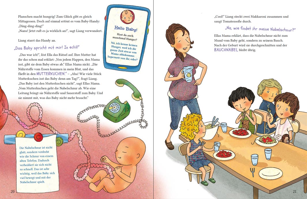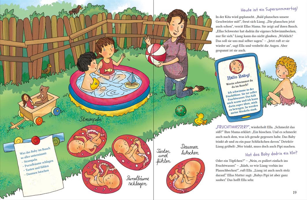 Zwei schwangere Mamas! Zwei Kindergartenfreunde Ella und Liang! Und jede Menge Kinderfragen: Wie kommen Papas Samen in Mamas Bauch? Woher weiß das Baby, ob es ein Mädchen oder Junge wird? Macht das Baby im Bauch schon Pipi? Die beiden Baby-Detektive Ella und Liang, wollen immer mehr wissen, um dem Wunder des Lebens auf die Spur zu kommen. Am besten mal selbst das Baby im Bauch anrufen – per Rollenspiel Baby-Talk. Hier gibt’s Aufklärung auf Augenhöhe, locker erzählt mit einem Augenzwinkern.