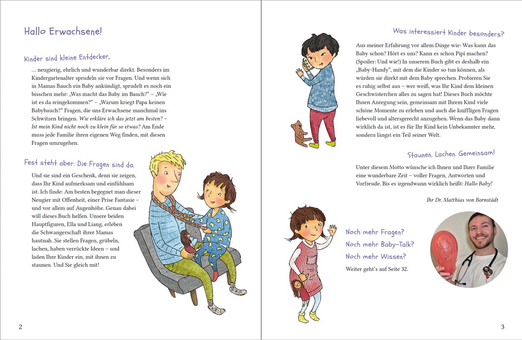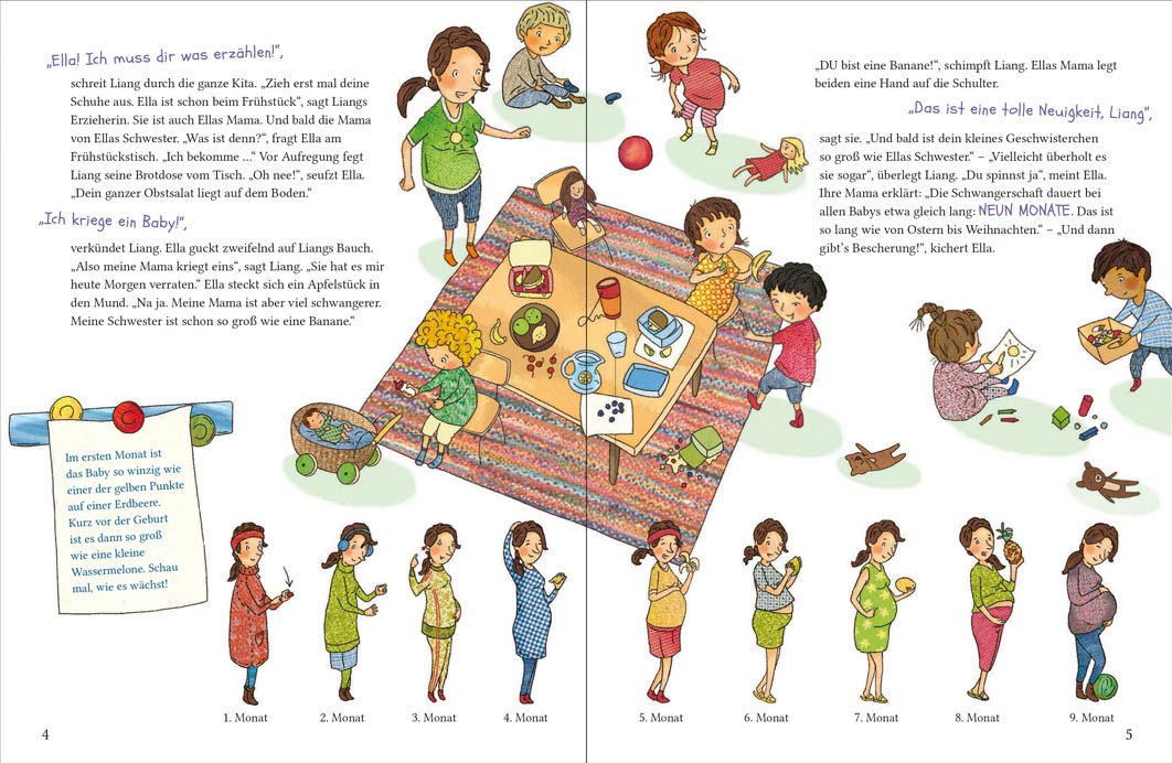 Zwei schwangere Mamas! Zwei Kindergartenfreunde Ella und Liang! Und jede Menge Kinderfragen: Wie kommen Papas Samen in Mamas Bauch? Woher weiß das Baby, ob es ein Mädchen oder Junge wird? Macht das Baby im Bauch schon Pipi? Die beiden Baby-Detektive Ella und Liang, wollen immer mehr wissen, um dem Wunder des Lebens auf die Spur zu kommen. Am besten mal selbst das Baby im Bauch anrufen – per Rollenspiel Baby-Talk. Hier gibt’s Aufklärung auf Augenhöhe, locker erzählt mit einem Augenzwinkern.